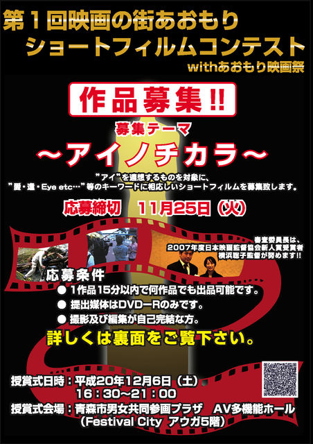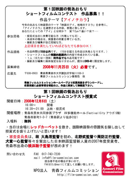 管理人様、お邪魔でなければこの場をお借りします。 不適切でしたら削除の方宜しくお願いいたします。 NPO法人 青森フィルムコミッションでは、団体設立事業第1弾として、 ショートフィルムコンテストを12月に実施致します。 そこで、我々は現在までショートフィルムの作品募集を行って参りました。 現在も多数の応募作品を集めておりますが、 コンテストの質のアップを目指し、 ここで今一度、作品募集のお願いをかけたいと思います。 作品テーマ【アイノチカラ】 今年のあおもり映画祭のテーマ「映画のアイ、地域のチカラ