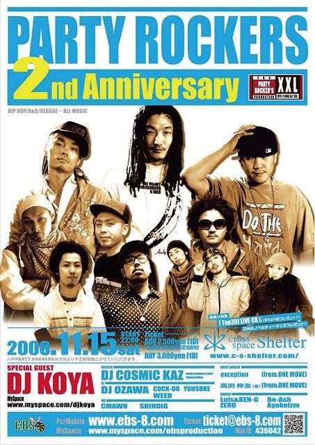<< PARTY ROCKERS >> 〜2nd Anniversary SP〜 2008.11.15(SAT) @hachinohe SHELTER open 22:00 - 先着順でZIMA ノベルティーグッズ プレゼント - ☆前売¥2500(1D+1LIVE MIX-CD)限定150枚 ※TOP DJ3人のうちいずれか1枚選べます。 ☆当日¥3000(1D) [ SP-GUEST ] DJ KOYA (R-RECORD from.TOKYO) DJ COZMIC KAZ (EBS from.SENDAI) [ DJ ] OZAWA (EBS) COCK-DO YOHSUKE (FLOW-JACK) WEED (D.N.A) [ MC ] CMAWN SHINDIG [ GUEST-DANCER ] exception(from.ONE MOVE
