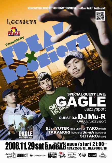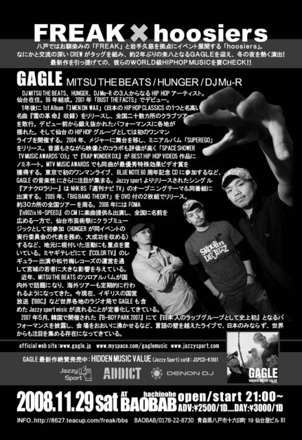 八戸ではお馴染みの「FREAK」と岩手久慈を中心にイベント展開する「hoosiers」。 なにかと交流の深いCREWがタッグを組み、約2年ぶりの来八となるGAGLEを迎え、冬の夜を熱く演出! 最新作を引っ提げての、彼らのWORLD級HIPHOP MUSICを要CHECK!! 【FREAK × hoosiers】 2008.11.29(sat)@dj bar BAOBAB special guest live : GAGLE(Jazzysport) guest DJ : DJ Mu-R(GAGLE/Jazzysport) DJ's : YUTER(FREAK),TARO(FREAK),SEITARO(FREAK) TAKAMORI(hoosiers) open&start/21:00〜 ticket adv/2,500