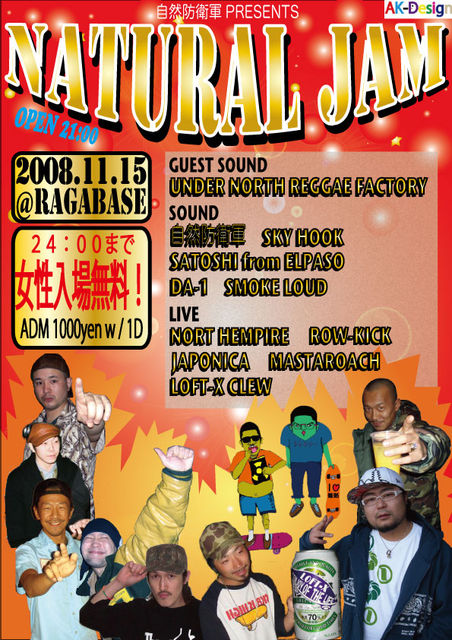 自然防衛軍 PRESENTS 『NATURAL JAM』 @Ragabase 2008/11/15(saturday) TICKET \1000(1D)12時まで女性無料 OPEN.START21:00〜 Guest sound under north reggae factory SOUND ・自然防衛軍 ・satoshi from ELPASO ・SMOKE LOUD ・sky hook ・da-1 LIVE SHOW CASE ・nort hempire ・row-kick ・mastaroach ・loft-x crew INFO:090-5184-2403(自然防衛軍) 告知です!! 自然防衛軍久々のダンス! 今回はゲストに陸奥からunder north reggae factory登場! 八戸三沢からはいつも現場