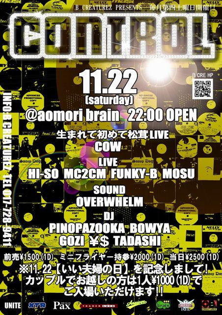 今月もやってまいりましたCONTROL!! 当日は「いい夫婦の日」という事でカップルでお越しのお客様はお得になっております!是非気になるアノ子を誘って遊びに来て下さい♪ SPECIAL LIVEには今月生まれて初めて松茸を食した記念にCOWがスタンバイ! DJ PINOは今月が誕生月という事でお祝いスピン!! 皆様のお越しをお待ちしております★ ◆CONTROL〜いい夫婦スペシャル〜 11/22(Sat) @brain 22:00 START!!!! ◆生まれて初めて松茸LIVE COW(ING) ◆LIVE HI-SO MC2CM FUNKY-B MOSU ◆SOUND OVER WHELM ◆DJ's PINOPAZOO
