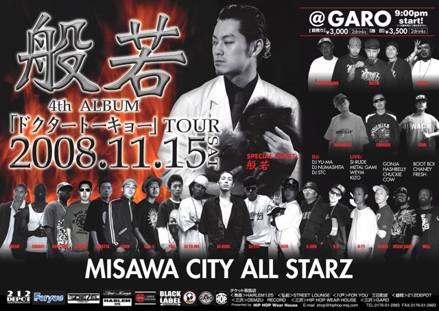 管理人様、告知失礼いたします。 【般若】 4TH アルバム『ドクタートーキョー』ツアーライブ ■11月15日(土) ■@GARO ■21:00〜 ■SPECIAL GUEST: 般若 ■DJ: DJ YU-MA DJ NUMASHITA DJ STC ■LIVE: SI-RUDE KEN-RYW(急遽参加) METAL GAMI WEYM KIZO GONJA HASHBELLY CHUCKIE COW BOOT BOI CHANEY FRESH ★MISAWA CITY ALL STARZ ■VJ: NATSUKO ■PRICE: 前売り 3,000円(2D) 当日 3,500円(2D) ★今回初のライブを行うMISAWA CITY ALL STARZは三沢で現役で活躍している