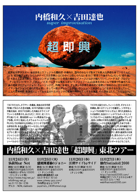 コスモスの出演ではありませんが、メンバーの工藤洋岳氏が参加するライブの紹介をさせてください。 彼はオープニングアクトのdubbudsで参加します。 メインの2人は東北ツアーの一環で来弘です。 県内では弘前だけの開催、メール予約もOKです。 めったにない機会なので、お誘い合わせの上ぜひおいでください!! 内橋和久×吉田達也「超即興」 -------------------------------------------------- 超絶変拍子ドラマー・吉田達也とエフェクトの魔術師・内橋和久、国内のみならず欧米でも絶大な評価を得ている二人による「超即興デュオ」