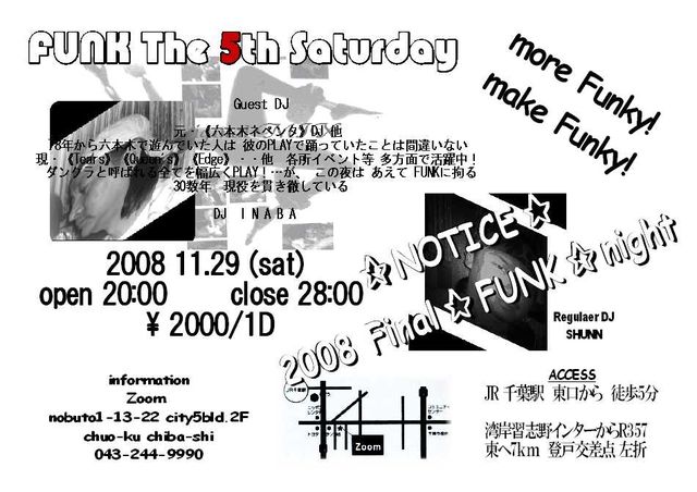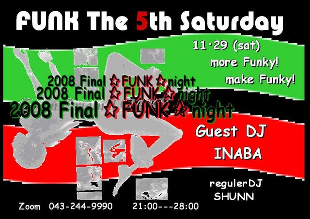 〜★FUNK★the 5th Saturday〜 ★2008★F★I★N★A★L★ ::::more Funky !:::: ::::make Funky !:::: 《The 5th Saturday in Zoom》 年に4回のZoom第5土曜日は もっと Funkyに! どっぷりFunkyに! 1970年代・・Discoが大ブレイクした その前から そして今も、『大衆の踊り場』の原点・黒人音楽! Funk&Soul sound 遠く母国を離れ、縛り付けられた日常からの開放を 週末に集まり つかの間の快楽を求めた兵隊達が 「音」と「踊り」で造り上げたあの空間を たまには そしてどっぷり味わってみま