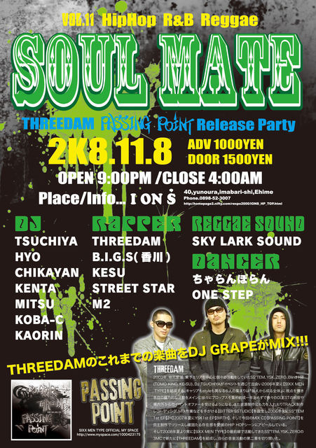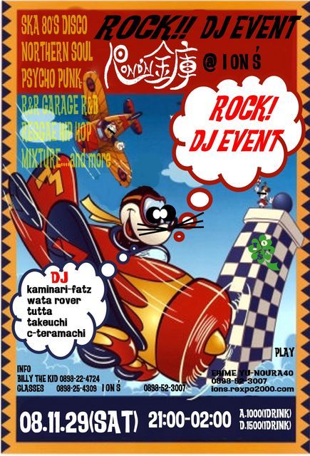 2008 11/22 (SAT) Place 今治湯ノ浦 ION`S JAM PuRunner Presents REGGAE I LAND OPEN9:00〜CLOSE3:00 ADV:1500/1drink DOOR:1500/no drink SOUND JAM PuRunner (今治) PON DI ZION (四国中央市) AATY KING (松山) IRIE KING (松山) BLESS SHOT (松山) CANDY BOMB (松山) DEEJAY MAA (今治) DUMP (今治) HASSIVE (松山) 米満 (松山) CAP MONSTA (松山) MARSHALL ART (松山) MI-MAN (西条) FOOD PAPA`S Jerk (M2) 偶数月第4土曜日に今治湯ノ浦ION`Sにて、毎回行っておりますSOUND I LANDからJAM PuR