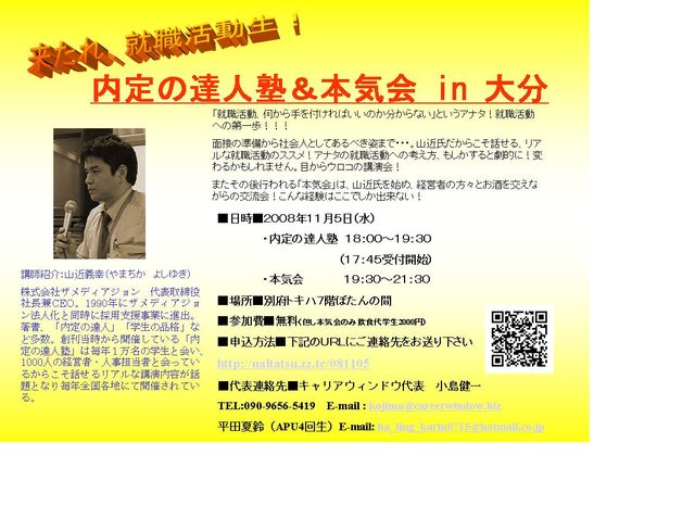 はじめまして、3回生の高橋ですわーい(嬉しい顔) 来月、トキワで「内定の達人塾」という講演会が行われます。 いま3回生には是非参加してほしいです!! 就活の準備がてらに 来てみてください! 申し込みは下記からお願いしますパソコンmail to 講演会をしていただくのは、雑誌のザ・テレビジョン で有名な、ザ・メディアジョンという企業の社長でもある、 山近社長です!!! 吸収できるものがチョットでもあるかもしれません。 ぜひ?!!!山近社長の講演会だけでも聞きにきてください あとexclamation ×2講演会の後は 生の社