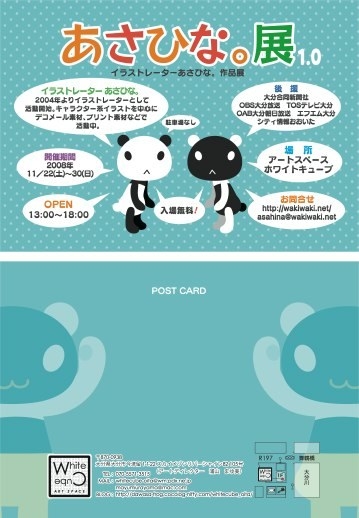 アートスペースホワイトキューブより、次回企画のご案内をいたします。 あさひな。展 “1.0”(いってんぜろ) 2008年11月22日(土)〜30日(日)全9日間   OPEN/13:00〜18:00 入場無料   駐車場/なし 後援:大分合同新聞社 OBS大分放送 TOSテレビ大分    OAB大分朝日放送 エフエム大分 シティ情報おおいた ホワイトキューブにおける次の企画ですが、大分在住のイラストレーターあさひな。さんの個展です。 あさひな。さんは、デコメ素材やFlash、イラスト等を作成されているイラストレーターさんで、本当に様々