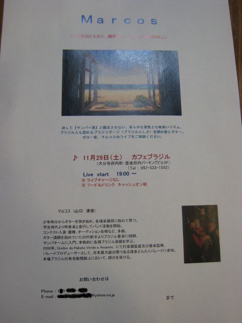 レイソル戦観戦会後の19:00ごろから”カフェブラジルに集えッ!”コミュhttp://mixi.jp/view_community.pl?id=726228の管理人、Marcosさんhttp://mixi.jp/show_friend.pl?id=2867937のサンバライブを行います。 日時:11月29日(土) 19時スタート(レイソル戦次第で時間は前後します) 場所;府内町カフェブラジル  〜以下、コミュに掲載のマルコスさんの告知を引用〜 別府市・大分市・福岡市などでライブ活動を行い、 また打楽器奏者としても活動中。 メディアでの紹介や、各方面からの 評価を頂いております。