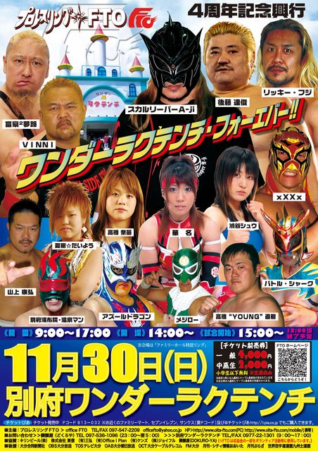 大分県を拠点に活動しているプロレス団体プロレスリングFTOの4周年記念大会のお知らせです。 ワンダーラクテンチとしては最後の日となるこの日にFTOがワンダーラクテンチフォーエバーと題して、大会を開催いたします。 プロレスのチケットで、ラクテンチの入園料やケーブル料が含まれており、小学生以下であれば、すべて無料!! ワンダーラクテンチとしては、最後となるこの日!ぜひお越しください。 なお当日は、皆様方のチケット代から車椅子を購入し、大分県下の施設や病院に寄付する予定です。 チケットのご希望はxXXxまでメッセー