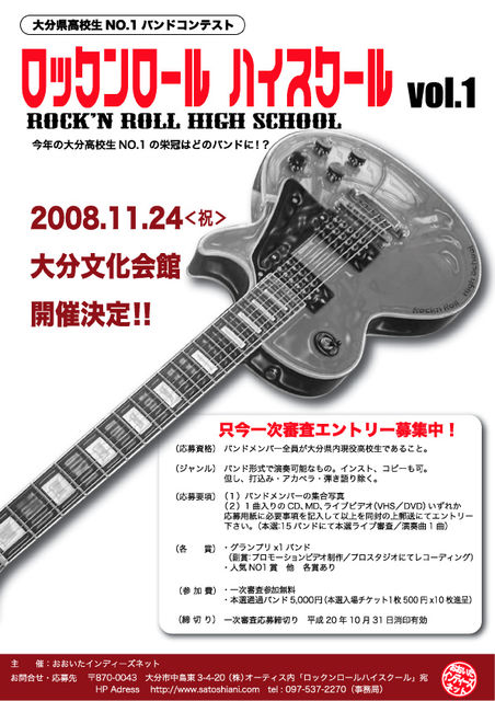 大分県高校生NO.1バンドコンテスト 11月24日(月・振休)PM3:30(OPEN)PM4:00(START) 出演(順不同):ばんだる2008、LOGOS、Gross boys、カフカ、THE BABY GIRL、The Bridge、THE 井の中の蛙、HEART FIELDS、Spike Hillz、3baft sketch、Droog、MIRAGE、SPY MONSTER、take away ゲスト:SKIN-HEADz 料金:500円 場所:大分市大分文化会館大ホール 主催:NPOおおいたインディーズネット 詳細:http://www.satoshiani.com/06highschool/index.html 「おおいた音ねっと」内で、ペア10組計20名に入場チケットプレゼント実施中。 http://www.oto-net