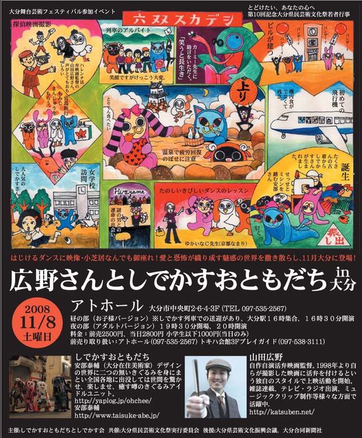 昼の部はお子様バージョン、夜の部はアダルトバージョンとして開催。 昼の部はしでかす列車(おともだちとのゆかいな電車ごっこ)での送迎あり。大分駅に16時に集合です。みんなで参加しよう(しでかす列車に乗るには入場券が必要です。その場でも買えます)! 大分舞台芸術フェスティバル2008参加行事 「広野さんとしでかすおともだち in 大分」 開演 16:30/20:00 出演:しでかすおともだちと山田広野 料金:前売・予約2500円/当日 2800円    小学生以下1000円(当日券のみ) ※チケットはアトホール、トキハ会館(097-538-1111 内線