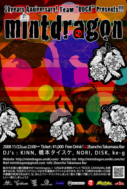 TEAM-ROCK presents!!! 『mintdragon』 2008.11.22(sat) @2Bancho Takamasa Bar OPEN/START 22:00 Ticket:1,000yen Free Drink!!! DJ's: KINN 橋本タイスケ NORI DISK Ke-g mintdragon Web↓ http://mintdragon.omiki.com/ 12月は年末恒例イベント「ROCK CARAVAN」を開催するため、今回がミンドラとしては今年最後のイベントになります。 そこで、10周年のお祝いと日頃の感謝の気持ちを込めて、な、なんとフリードリンクにしました!飲んで騒いで踊って、忘れられない楽しい一夜にしましょう♪ P.S 今回Select CDを作った