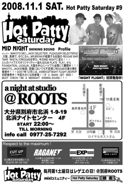 「Hot Patty Saturday #9 special」 2008.11.1 SAT @ROOTS 大分県別府市北浜 1-9-19 北浜ナイトセンター4F info call 0977-25-7292 レゲエ激戦区、大阪からMID NIGHT shining soundが大分県に初登場! Barrier free soundと共に大阪を中心にWICKYなMCとオリジナリティーあふれる dub plateはもちろんfundation,jungglin playとバイブス全開で活動中! If u waan get mad! must check! Mid night shining sound!!! special guest MID NIGHT shining sound sound SPIRAL CASE / MAD FOX / SUNLINE / EIGHTY 8 / ONE PEACE / TE
