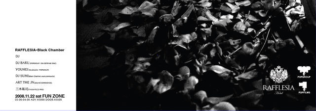 管理人様、告知失礼致します。 【RAFFLESIA×Black Chamber】 2008.11.22 (sat) @FUNZONE(ex.UNDERGROUND) adv.3,000円 door.3,500円 open/start 22:00〜4:00 -GUEST DJ- DJ BAKU(DIS-DEFENCE DISC.POPGROUP) YOUHEI (Replicant.POPGROUP) -DJ- DJ SUMI(Black Chamber.yoursystemsucks) AKT THE JN (SOUNDEXPERIENCE) 三木祐司 (TAILGATE.ZZ PRO)