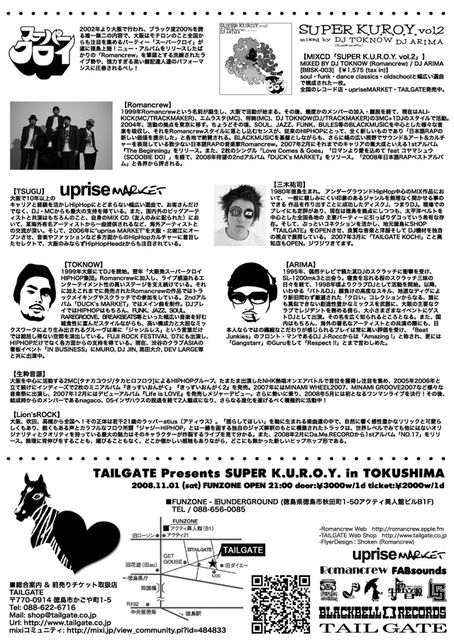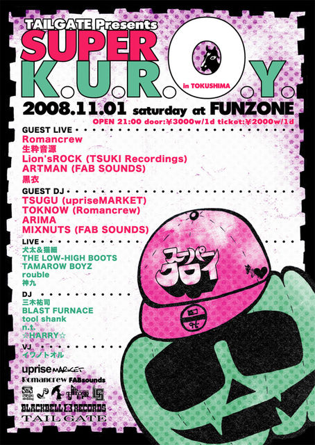 ---------- 〜TAILGATE Presents〜 スーパークロイ in 徳島 ---------- 開催日時 / 2008年11月1日 (土曜日) 21時スタート 会場 / FUNZONE - 旧UNDERGROUND (徳島県徳島市秋田町1-50アクティ異人館ビルB1F) 会場TEL / 088-656-0085 ---------- 前売り / 2000円 1ドリンク 当日 / 3000円 1ドリンク ---------- ■GUEST LIVE Romancrew 生粋音源 Lion'sROCK (TSUKI Recordings) ARTMAN (FAB SOUNDS) 黒衣 ■GUEST DJ TSUGU (upriseMARKET) TOKNOW (Romancrew) ARIMA MIXNUTS (FAB SOUNDS) ■LIVE 犬
