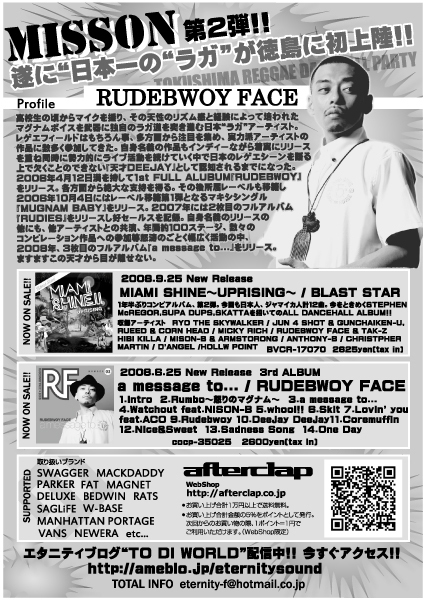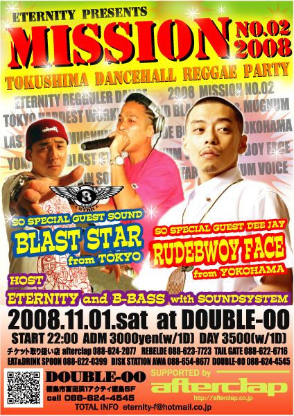 ETERNITYダンス“MISSION”第2弾!! 11月1日土曜開催決定!! 遂に日本一のラガが徳島に上陸!! さらに東京No.1 HARDEST WORKING SOUND登場!! ★TOKUSHIMA DANCEHALL REGGAE PARTY★ ETERNITY PRESENTS 『MISSION No.2』 ◇2008.11.01.sat ◇at DOUBLE-OO ◇22:00〜5:00 ◇ADM 3000yen(w/1DRINK)  ◇DAY 3500yen(w/1DRINK) ★SO SPECIAL GUEST DEEJAY★ ---RUDEBWOY FACE from横浜------- Rudebwoy Face Official HP http://www.rudebwoyface.com/ My Space http://www.m