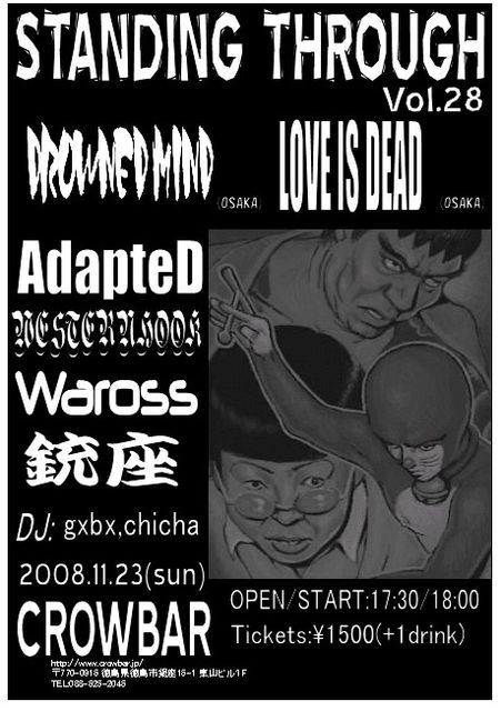 "STANDING THROUGH vol.28" [ ACT ] LOVE IS DEAD DROWNED MIND 銃座 AdapteD WESTERNHOOK Waross [ DJ ] gxbx chicha [ Guest-DJ ] 零(SAAG) [ OPEN / START ] 17:30 / 18:00 [ ADV ] 1,500yen ( +1drink 500yen ) 【徳島 CROWBAR】 http://www.crowbar.jp/ 〒770-0916 徳島県徳島市銀座16-1 東山ビル1F TEL:088-625-2046
