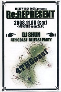 管理人様、告知失礼します。 ------------ THE LOW-HIGH BOOTS presents Re:REPRESENT DJ SHUN 「4THCoast」 Release Party Tour in Tokushima ------------ 日時、2008.11.08[sat] 場所、FUN ZONE(ex.UNDERGROUND) 開始、22:00〜 チケット前売、¥1500(+1ドリンク) 当日、¥2000(+1ドリンク) チケット前売り予約:tlhb.db@gmail.com 前売りチケット取扱店舗 FUN ZONE / REBELDE / XTHREE / AFTER CLAP / TAILGATE / AAO / CitaCita ■GUEST DJ SHUN (from MATSUYAMA / JUICE) ■DJ's SUM