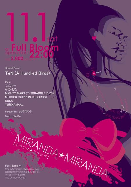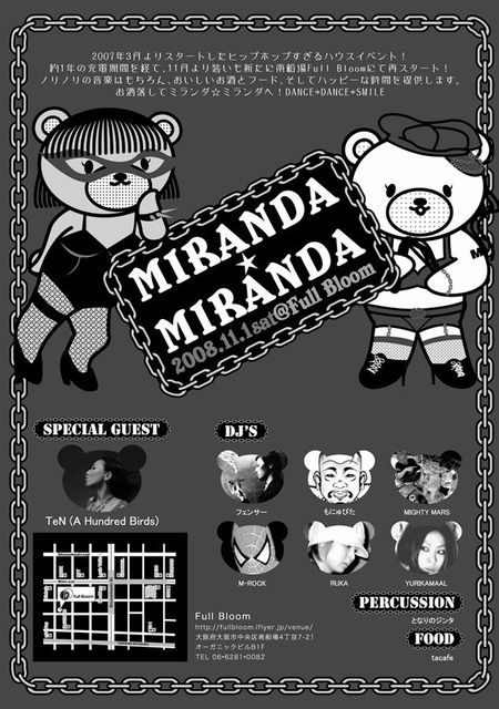 MIRANDA☆MIRANDA 2008年11月1日(土)at Full Bloom(南船場) OPEN/START 22:00〜 DOOR 2,000円(1drink) 2007年3月よりスタートしたヒップホップすぎるハウスイベント! 約1年の充電期間を経て、11月より装いも新たに南船場Full Bloomにて再スタート! ノリノリの音楽はもちろん、おいしいお酒とフード、そしてハッピーな時間を提 供します。 お洒落してミランダ☆ミランダへ!DANCE*DANCE*SMILE Special Guest: TeN(A Hundred Birds) DJ's : フェンサー もにゅぴた MIGHTY MARS(T-SKRABBLE DJ'S) M-ROCK