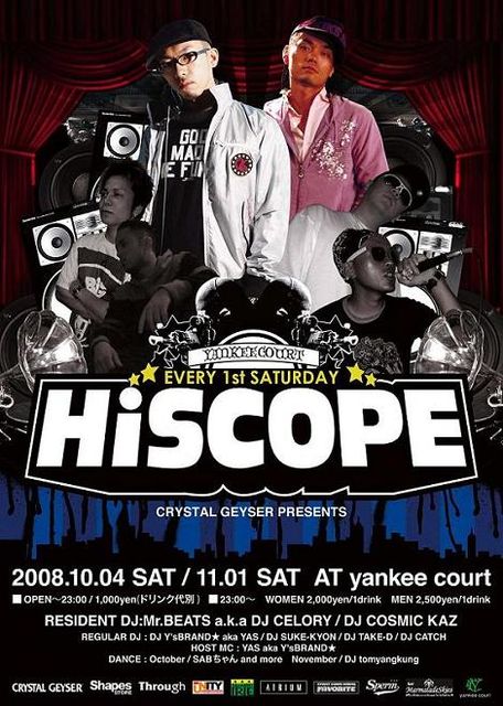 毎月第1土曜日開催の「HiSCOPE」新木場ageHa,渋谷Harlem,Nutsなど様々なイベントで活躍中のDJ CELORYと、東北No.1パーティーロッカーDJ COSMIC KAZがレジデントDJを務め、さらにY'sBRANDのグルーヴィなMI