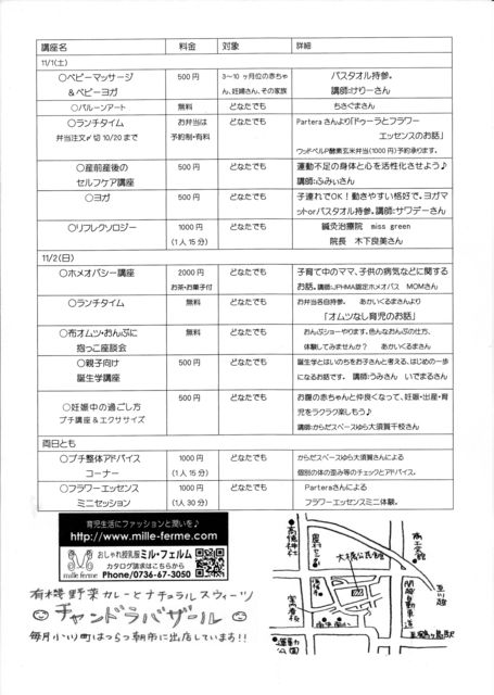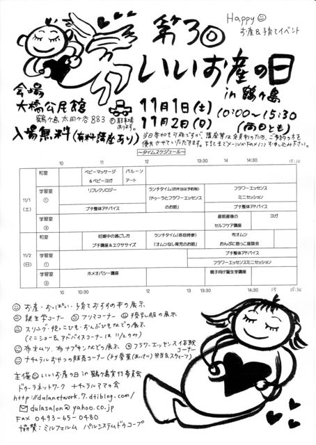 第3回 いいお産の日in鶴ヶ島 日時 : 11月1日(土)、11月2日(日)両日とも10時〜16時 会場 : 大橋公民館(http://www.city.tsurugashima.lg.jp/section/oohashi.html) 鶴ヶ島市太田ヶ谷883 駐車場あり 〜入場無料〜(有料講座あり) 当日参加も可能ですが、講座等は定員制の為ご予約の方を優先させて頂きます。 ◎11/1(土) 和室 ★10時半〜11時半〇ベビーマッサージ&ベビーヨガ(500円) 対象:3〜10ヶ月位の赤ちゃん、妊婦さん、その家族 バスタオル持参。 講師:けりーさん ★11時半〜12時〇バルーンアート(無料)