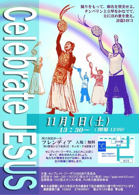 http://gtgjh.web.fc2.com/ 川口市民ホール フレンディアにて (川口駅東口徒歩1分 右手の「キュポラ」ビルの4階です。) 入場無料 自由献金あり 共にイエス様を信じるものとして 御言葉に従い、イエス様の旗を掲げ タンバリンと踊りをもって神様をほめたたえます。 今年は、オリンピック直前の中国に行って、 神様に讃美をささげる機会も与えられました。 その恵みのお証もさせていただきます。 期待してお越しください。