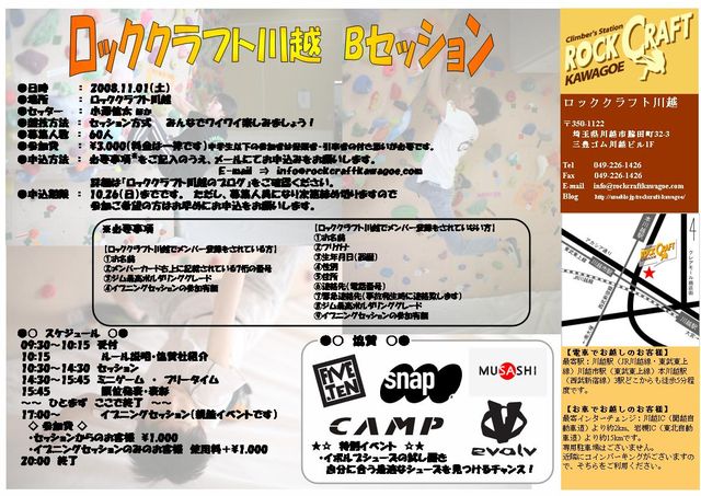 10月に突入し、ヒド〜イ暑さも収まりメッキリ秋めいてきました。 秋といえば・・・・そう『スポーツの秋』です。 と言うことで、ロッククラフト川越でボルダリングセッションを開催することになりました。 − 記 − ロッククラフト川越Bセッション ●日時:2008年11月01日(土) ●場所:ロッククラフト川越 ●セッター:小澤信太ほか ●競技方法:ボルダリングセッション みんなでワイワイ楽しみましょう ●募集人数:60人 ●参加費:\3,000(料金は一律です)中学生以下の参加者は保護者・引率者の付き添いが必要で