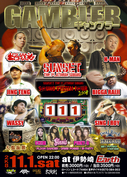 告知して礼します サンセットのシステムツアーを群馬の伊勢崎アースで行います! もちろんフルセット! □詳細□ タイトル ギャンブラー SUNSET THE PLATINUM SOUND SOUND SYSTEM TOUR 2008 日時 2008/11/1 22:00〜 場所 伊勢崎 Earth 群馬県伊勢崎市宮子町3082-2 0270-26-2966 料金 前売 3000円(1D) 当日 3500円(1D) Lコード 74464 出演者 GUEST SOUND SUNSET GUEST DeeJay H-MAN / GUAN CHAI / JING TENG / BIGGA RAIJI / SING J ROY / WASSY