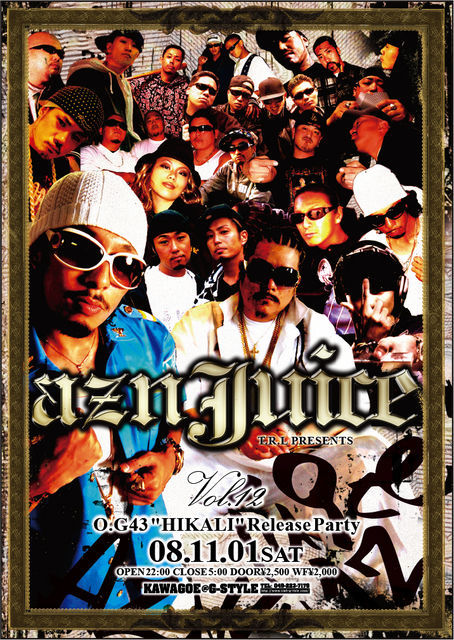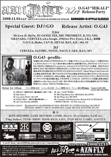 2008/11/01(SAT) T.R.L-PRESENTS 「AZN Juice-vol.12」 〜O.G43 "HIKALI" Release Party〜 埼玉県川越市 @G-style OPEN 22:00 CLOSE 5:00 DOOR \2500/1D W/F \2000/1D 「Special Guest」 ・DJ☆GO 「Release Artist」 ・O.G43 (LARC RECORDS) 「Live」 ・Mr.Low-D ・MoNa ・JO-G&TEE TEE ・MIC PRESIDENT ・K-YO ・GIO ・GRANADA ・CERVEZA a.k.a boogie ・254(two Five Four) ・J.K.L ・勇次郎 ・N.O.N.A ・Hades ・CAN-D ・METAL BAT ・A2C ・104 ・ST 「DJ」 ・CERVEZA ・SATORU ・NOTSU ・PAC