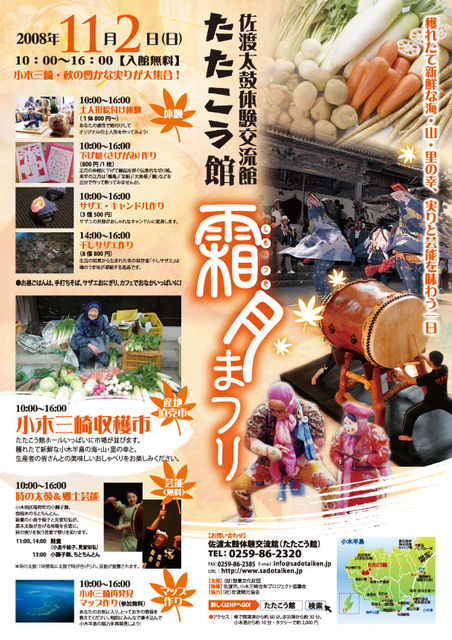 好評いただいております 佐渡太鼓体験交流館「たたこう館まつり」。 今回は11月2日(日)「霜月まつり」です。 「穫れたて新鮮な海・山・里の幸、実りと芸能を 味わう1日」と題し、小木三崎の産地直売市をはじめ、 様々な芸能や体験コーナーを企画しています。 http://www.sadotaiken.jp/yotei_j.html メイン企画は体験ホールに小木三崎の市(いち)が 約10店舗も並ぶ<小木三崎収穫市>。 体験コーナーとしては 〇正月の縁起物<下げ紙作り> 〇貝殻を再利用<サザエ・キャンドルづくり> 〇小木三崎でもおじ