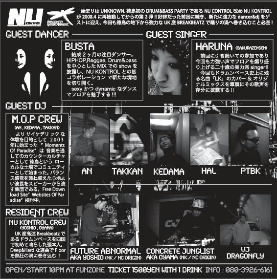 告知失礼致します。 11/02(SUN) (※翌日文化の日) NU KONTROL @FUNZONE TICKET:¥1500 with 1drink 始まりはUNKNOWN.徳島初のDRUM&BASS PARTYであるNU CONTROL改めNU KONTROLが今年4月に始動してからの第2弾!!好評だった前回に続き、新たに強力なdancer & djをゲストに迎え、今回も徳島の地下から強力なUK産BreakBeatzでフロアを踊りの渦へ巻き込むこと必至!! resident DJs : FUTURE ABNORMAL a.k.a YOSHIO (NU KONTROL CREW) CONCRETE JUNGLIST a.k.a OYAMA (N