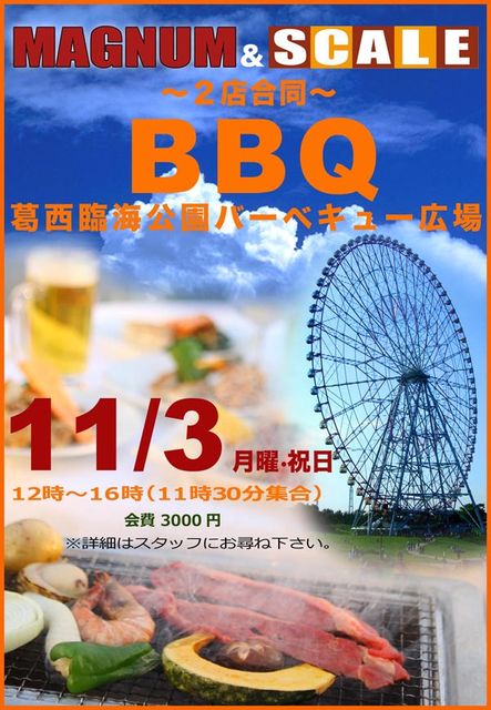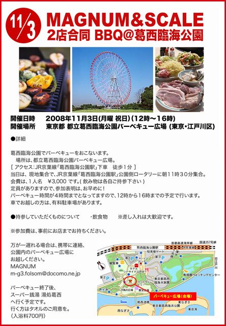 みなさん、お元気ですか? やっと秋になってきましたね!すごしやすくなってきました。 さて、今年も葛西臨海公園でバーベキューをおこないます。 今回は、『SCALE』さんと合同です。 秋の一日、みんなでバーベキューを楽しもう! ぜひぜひ、お誘い合わせの上ご参加くださーい。よろしくお願いします。 ●開催日時 2008年11月3日(月曜・祝日(12時〜16時)) ●場所は、都立葛西臨海公園バーベキュー広場。 [ アクセス:JR京葉線「葛西臨海公園駅」下車 徒歩1