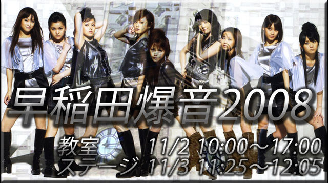早稲田大学モーニング娘。研究会幹事長の宮ちゃん♪と申します。 早稲田爆音2008を開催することとなりました! メインステージでの爆音は昨年度5000人以上の集客実績があります。これほど多くの一般人の前でヲタ芸を打てる機会はそうそうないと思いますので、ご興味ありましたらご参加ください! ■□■□早稲田大学モーニング娘。研究会presents 早稲田爆音2008■□■□ 去年初開催で大好評を博した早稲田爆音が今年も開催決定! 教室編は床面積が昨年の3倍!大教室がダンスフロアに大変身。 早稲田モー研DJ陣が時間帯ごとに色を変えてお届