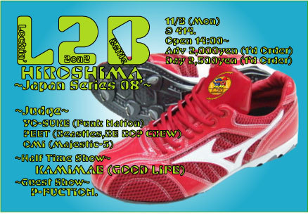 =L2B HIROSHIMA=~Japan Series 08'~ 2ON2 Lock Battle Contest開催! “L2B”が今年より全国展開する事になりました! 大阪・名古屋・広島でも開催決定!! 福岡・大阪・名古屋・広島のチャンピオン達が12月開催のL2B Champion 大会で激突します!! 初開催の広島!一体誰が優勝するのか!? 賞金総額 30,000円 + 100,000,000円!? ■日時:11月3日(祝) ■場所:広島・4.14 ■時間:Open:14:00〜 ■料金:Adv 2,000yen(1drink order)      Day 2,500yen(1drink order) ■■