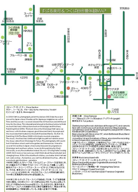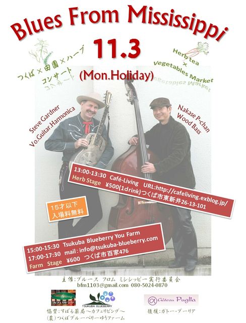 2008年11月3日(月)に、ブルースの故郷ミシシッピの音楽に触れるライブ演奏をつくば市内のハーブティのお店と田園風景の広がる農園で行います。つくばの純農地に、東京やつくばの都市部住民、特に大学生や高校生、外国人にも来てほしいということで、ライブコンサートを開催してみようということになりました。日頃繋がりのある「すばる薬局」(カフェ併設-お客の相互利用が盛ん-)とケーキ屋さんの「ガトー・プーリエ」(当園のブルーベリーを提供)と連携し、地域に根差