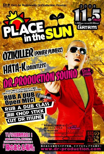 毎月第1水曜に開催しております、-Place In The Sun-次回の開催がついに来週に迫って参りました!!、先日1周年を迎えた『OZIKILLER』 from Power Playerz 、各地で活躍中の『 HATA-K』 from Dauntless 、とDr.Production Sound のレギュラーイベント!CHOP STICK先生による【RUB A DUB道場】あり、SOUND陣の間違いない選曲ありで楽しめること間違いなし!!!