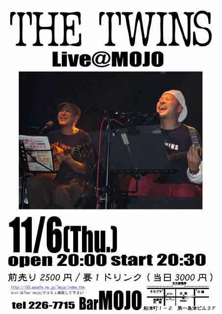 関西のソウルブラザーズ ツインズいよいよ6日に迫ってまいりました。 ソウル、ブルース、ゴスペル等とにかく楽しいは、聴かせるは盛り上がるんで、時間があれば是非お越しください。 トシ新町&きたぞのまゆみも参加致します。 OPEN20:00 START20:30 前売り2500円 当日3000円(要1ドリンク) 詳細ご予約はMOJO 0992267715まで。 宜しくお願い致します。