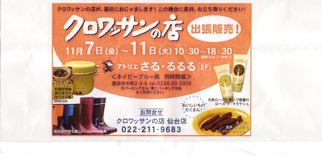 初めまして、はると申します。 この度、酒田市にある「アトリエさる・るるる」さん2Fの貴重なスペースをお借りして クロワッサンの店、仙台店の出張販売を11月7日(金)〜11月11日(火)までさせて頂きます! 【開催場所】さる・るるるさん:http://map.yahoo.co.jp/pl?type=scroll&lat=38.91423111&lon=139.83919139&sc=3&mode=map&pointer=on 【営業時間】10時半〜18時半(最終日11日は17時までです。) 雑誌クロワッサンでお馴染みの、生活雑貨や洋服、靴、全国各地お取り寄せの食料品、陶器などなど 仙台店おすすめの、選りすぐ