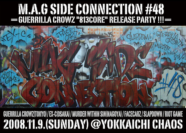 毎回、熱狂的に盛り上がりを見せる M.A.G SIDE C も48回目に突入!!! 今回は、東京を拠点に活動するハードコアバンド "ゲリラ・クローズ" の5 SONGS NEW CD "813CORE" のリリースパーティーだ!!