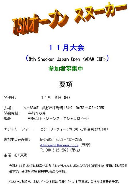 要項 開催日 : 11月9日(日) 会場 : b−SPACE 浜松市中野町164-2 ?053−422−2055 開始時刻 : 午前10時 服装 : 軽装以上(ジーンズ、Tシャツは不可) 参加申し込み先: b−SPACE ?053−422−2055 080-5125-2072(兼松) d-kanematsu@snooker.or.jp(兼松) 主催 JSA東海 ------------- 今回は11月30日に新宿サムタイムで行われるJSA JAPAN OPEN の 東海北陸地区予選です。 「エントリーフィー:\6,000(J