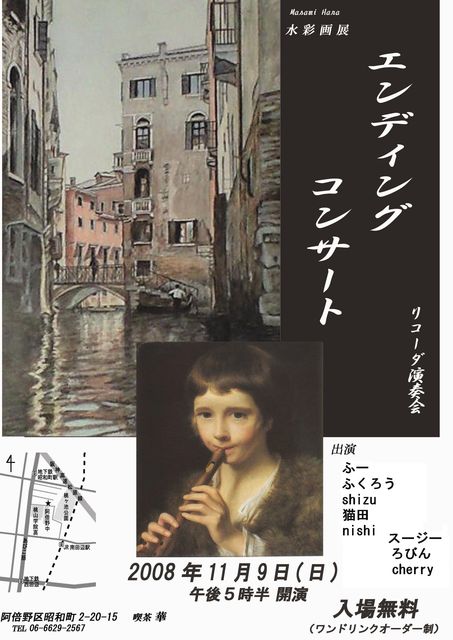 ヘンリーさんが「テーマ募集」で紹介してくださった企画のプレ企画 今後、En-join主催で定期的に発表会ができたらいいな〜 と思っています。 普段のイベントのように集まったメンバーで初見演奏ではなく、前もっってメンバーを組んで(ソロでも可)エントリーしていただき、コンサート形式で行います。 ・・・・・・・・・・・・・・・・・・・・・・・・・・・ 10月28日(火)から二週間、阿倍野区の喫茶店で父の水彩画の個展を開くことになりました。 場所はココです。 <http://maps.google.co.jp/maps?hl=ja&q=%E9