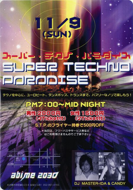 11月9日(日) PM7時〜 スーパーテクノパラダイス開催決定 今回も、テクノと言えばこの2名 DJ CANDY & DJ MASTER IDA 強力SPECALコンビがハイパーな激夜をお送りします お立台設置 1日盛り上がりっぱなしの激夜 前半から飛ばしまくりです そんな熱い夜 テクノを中心に・ユーロビー