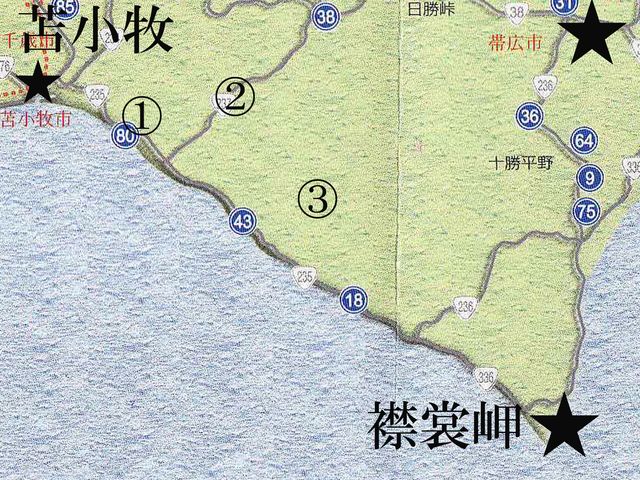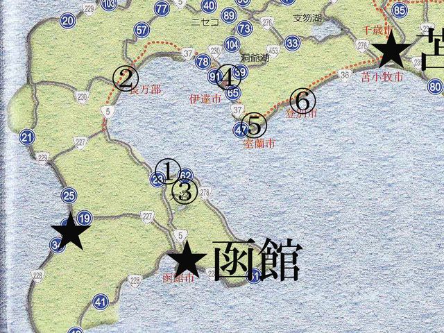 本日よりスタートします。 さてみなさんご用意はよろしいでしょうか? 移動は写真の★〜★です。 函館から東へ移動しますので今回は右端の★の苫小牧へ移動します。(写真上ではちょっと切れています) まずお勧め駅弁は(1)森町(もりまち)の「いかめし」と(2)長万部(おしゃまんべ)の「かにめし」が有名ですよ。他、苫小牧で「ほっきカレー」もいいかと思います。 移動中右手はずっと右手は海になります。 地図を見ていただくとわかりますがここは湾になっていて「内浦湾(うつうらわん)」といいますが(3)駒ケ岳(こまがたけ)