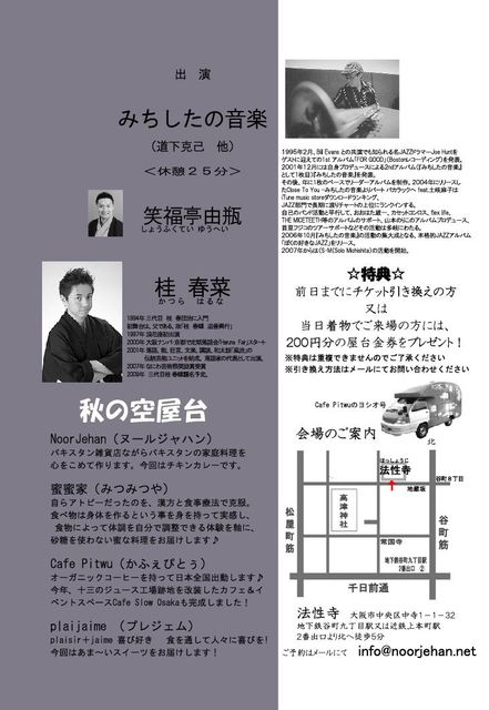 今回で3回目の企画となります。 JAZZトランペッター道下克己さん率いる”みちしたの音楽”と 落語家”桂春菜”のコラボレーションイベントです。 今回は場所を大阪中央区谷町九丁目の法性寺をお借りしての 拡大版となります。 もちろん内容も拡大! 今回は敷地内に4店舗の屋台も登場します。 限定フード&スイーツを是非ご賞味ください♪(別料金) 出演 みちしたの音楽 笑福亭由瓶 桂春菜 屋台 NoorJehan 蜜蜜家 plaijaime CafePitwe 公演後、出演者と屋台で食事をしながらの座談会の時間もあります。