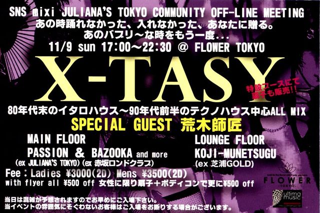 9月6日にディファ有明にてCLUB LEGEND(ジュリアナ復活イベント)が開催されましたが。。。 『あの日、踊れなかった、踊り足りない。あなたの為に . . .。』 皆さんのご要望もあり、オフ会&PARTY開催しちゃいます!! DATE / 2008.11/9(SUN)17:00〜22:30(予定) FEE / 女性3.000yen (2drink) 男性 / 3.500 yen (2drink) ・With Flyer又は当コミュの参加表明者は、更に500yen Off 女性に限り、ジュリ扇&ボディコンスタイルで更に500yen off最大1000yen off (20歳未満は入場不可/要IDチェックあり) ■スペ