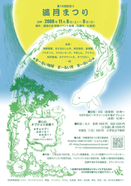 **********「第10回記念☆満月まつり」告知内容********** ☆★☆10周年を記念してキャンプインフェス開催!☆★☆ Coccoの「ジュゴンの見える丘」で有名になった 「大浦湾」で今年もやります「満月まつり」! 去年はゲストに 「みにまむす。」(from「赤犬」@大阪)と 「ショピン」(from「SAKEROCK」@東京)を迎えて 満月の下、生音で演奏してくれて みんなで輪になって踊った素敵な夜でした! (昨年の模様はhttp://mangetsumatsuri.ti-da.net参照) 今年は10周年ということで、 これまでに関わったミュージシャンだけでなく 「Peace