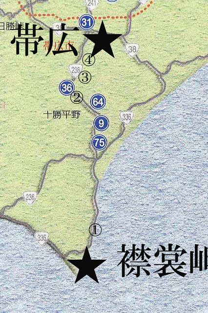 みなさん、飛ばされずにお集まり出来ましたか?? それでは移動しますよ。 今回は下の★から上の★へ移動。 写真は小さいけど名前入れましたのでわかりやすいかも 今回のお勧め食は帯広で豚丼でしょうかねぇ。 ちなみに私は帯広の豚丼は未経験であります。 写真内(1)は海岸沿いの道路です。 北海道在住の方でラジオで道路情報聞いている方だとよく耳にするでしょう。 「黄金(おうごん)道路」です。 さて、なぜこんな名前の道路かというとここの地形の問題でこの道路を作るにあたって普通の道路の倍の覆道を作る必要があり、