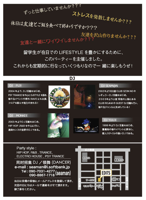 在日留学生のライフスタイルを豊するために、このパーティーを主催しました!もちろん、日本の学生 の、社会人の方々も大、大、大、大、大歓迎です 以下の質問に当てはまる人は是非、一度ご参加してくださいな ? ずっと仕事(アルバイト)をしていて、たまに一息したいあなた ? せっかくの休日なのに、友達とご飯を食べて(カラオケして)、まだまだ遊びたいあなた ? 仕事(アルバイト)で溜まったストレスをぱーっと発散したいあなた ? たまに、大勢の友達とワイワイしたいあ