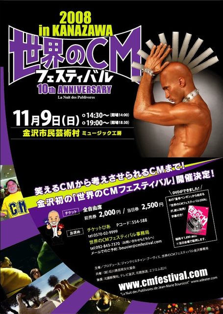 みなさん東京は楽しかったですか? 北陸でも負けずに開催します!北陸近郊のあなた、ぜひ遊びにきてください! 笑えるCMから考えさせられるCMまで 世界中から選りすぐった傑作CMを200本一挙放映! 「世界のCMフェスティバル in 金沢」11/9 開催!! www.cmfestival.com 世界各国で開催されている世界のCMフェスティバルをついに金沢で初開催! CMは単なる映像作品でなく各国の文化を色濃く反映したもの。 ぜひ傑作CMでうなり、笑いながら世界の文化に触れてみてください! さらに東京からのスペシャルゲストによるライブも同時開催!