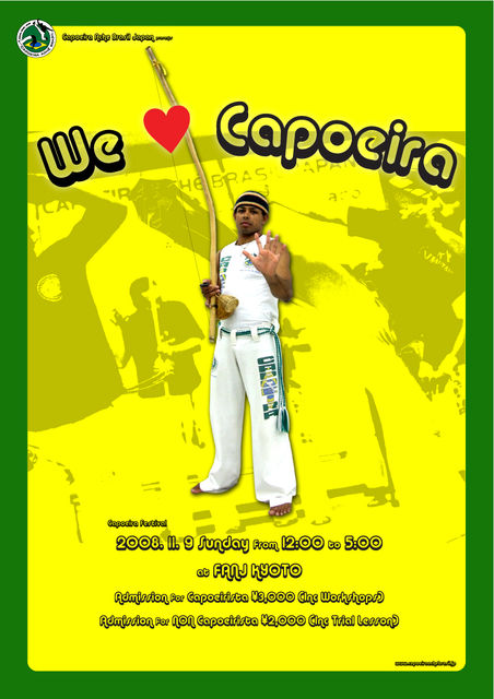 今年最後?の大型カポエイライベント! WE LOVE CAPOEIRA 日本全国から凄腕ブラジリアンカポエイラインストラクターが集まり、 ワークショップ祭りを開催! もちろんカポエイラ未経験者のための 体験カポエイラワークショップもあり! そして更にはカポエイリスタ達による カポエイラショーも盛りだくさん! 見逃すべからず!! 詳細 日時:11月9日(日) 会場:KYOTO FANJ 京都市左京区上高野車地町101番 時間:12:00 - 17:00 入場料金: カポエイリスタ料金 大人 ¥3000 子供 ¥1500 *ワークショップが2つ含まれています。